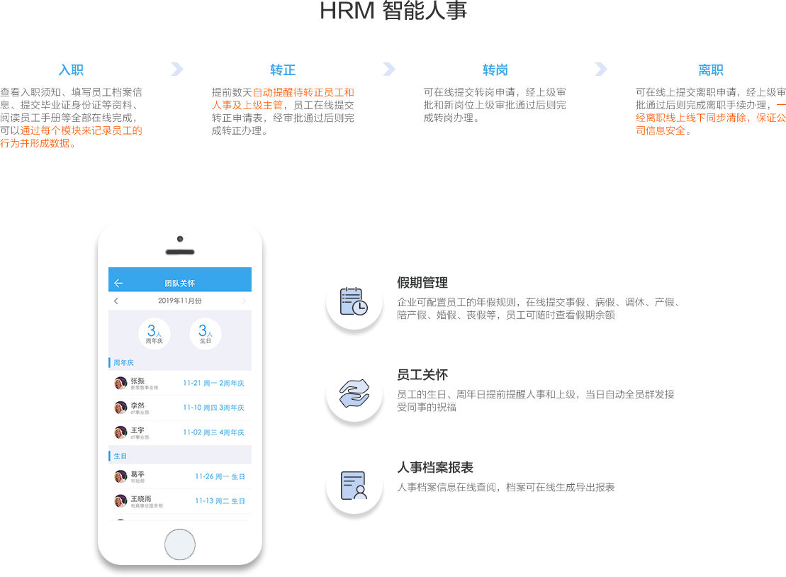 手机考勤,简单方便,统计考勤自动生成。随时随地查看团队状态,包括外勤人员形为状态,大幅提高人事效率。